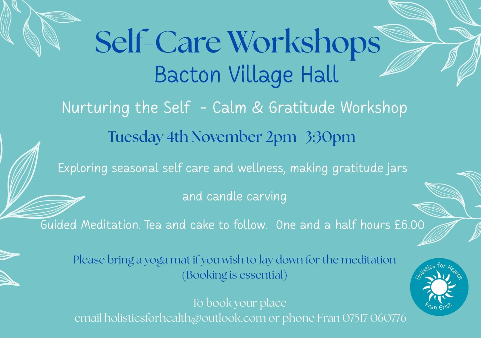 Self-Care Workshops Bacton Village Hall Nurturing the Self - Calm & Gratitude Workshop Tuesday 4th November 2pm-3:30pm Exploring seasonal self care and wellness, making gratitude jars and candle carving Guided Meditation. Tea and cake to follow. One and a half hours £6.00 Please bring a yoga mat if you wish to lay down for the...